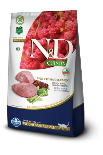 A Ração N&D Quinoa Gatos Adultos Weight Cordeiro é uma ração completa e balanceada e feita especialmente para gatos adultos com tendência ao ganho de peso ou castrados e ajuda a restaurar e manter o peso ideal, pois possui baixo teor de gordura.A linha N&D Quinoa da Farmina é uma linha de alimentos funcionais para auxiliar no bem-estar dos pets, feita especialmente para animais com necessidades nutricionais específicas.Feita com carne de cordeiro, proteína de alta qualidade, a Ração N&D Quinoa Weight Management também tem brócolis, aspargo e quinoa, que tem propriedades nutricionais que favorecem a digestão, a absorção de nutrientes e a saúde intestinal.