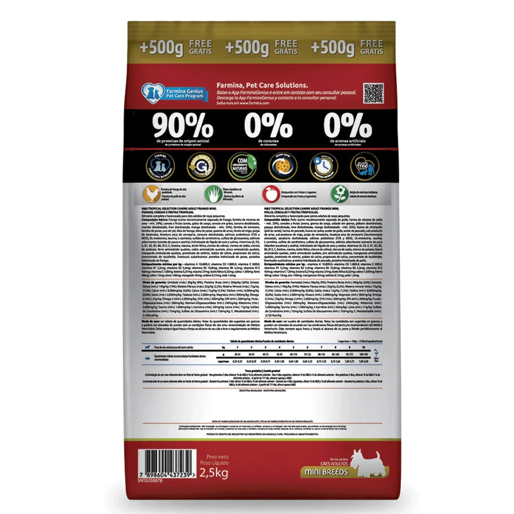 A Ração N&D Tropical Selection Cães Adultos Mini Frango foi elaborada especialmente para suprir todas as necessidades nutricionais dos cães adultos, é feita com ingredientes selecionados criteriosamente para dar uma vida longa e saudável a eles.A Ração N&D Tropical Selection fornece a quantidade necessária de nutrientes, graças a junção da proteína do frango e as frutas tropicais que são fontes de vitaminas, minerais e possuem ações antioxidantes, dando saúde a pele, pelagem e organismo dos pets.