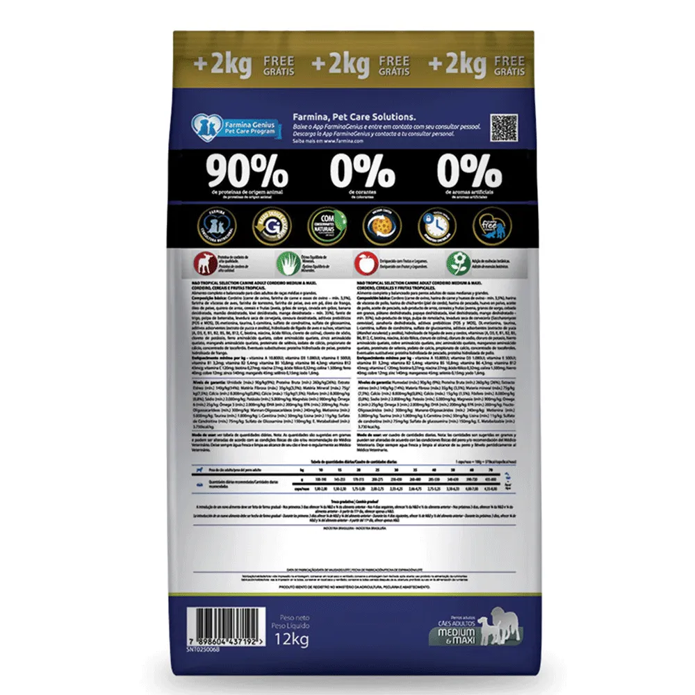 A Ração N&D Tropical Selection Cães Adultos Medium e Maxi Cordeiro foi desenvolvida de forma especial para proporcionar aos cães adultos uma alimentação completa e balanceada, sem deixar de lado a qualidade e o sabor.Sua composição é feita com 90% de proteínas de origem animal, não possui corantes, aromas artificiais e transgênicos. Além disso, conta com frutas tropicais para dar aos cães muitas vitaminas e minerais, mantendo um organismo forte e saudável.